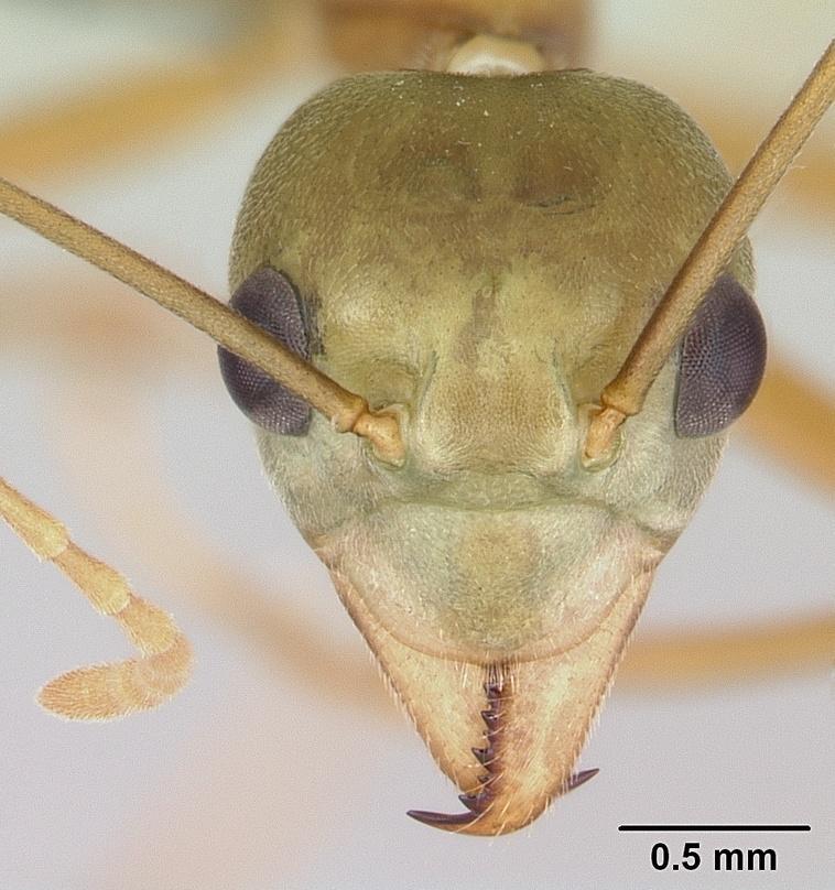 Głowa mrówki Oecophylla smaragdina. Mrówki te tworzą na drzewach masywne gniazda-kokony. Gatunek agresywny, atakujący zarówno żuwaczkami, jak i kwasem mrówkowym. Mrówki te mają w zwyczaju ograniczać dostęp do określonych roślin takim zapylającym owadom, które uznają za mało skuteczne, a dopuszczać do kwiatów tylko te najbardziej wydajne. Fot. www.AntWeb.org, CC BY